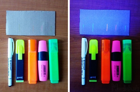 Porovnanie fariebrôznych zvýrazňovačov pod UV svetlom.